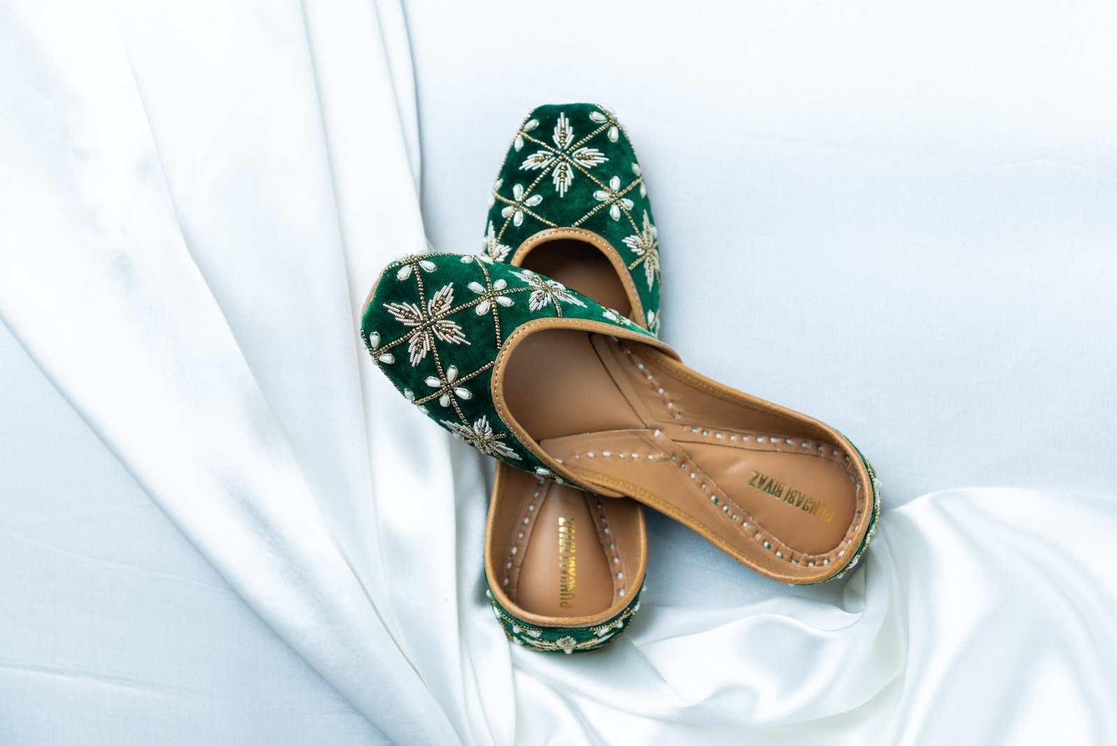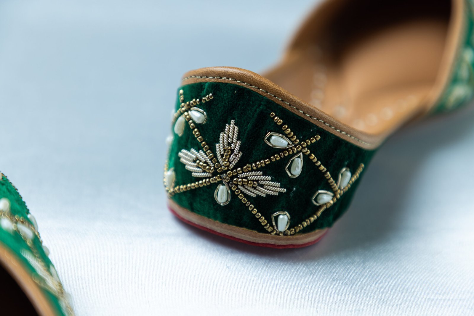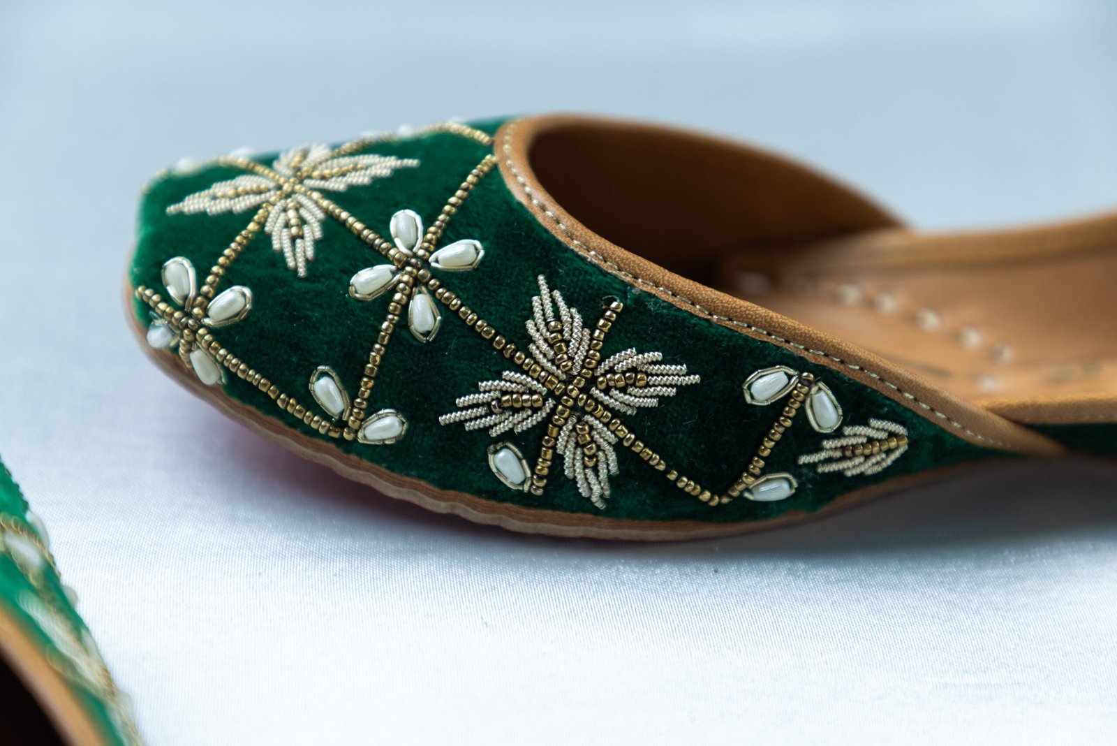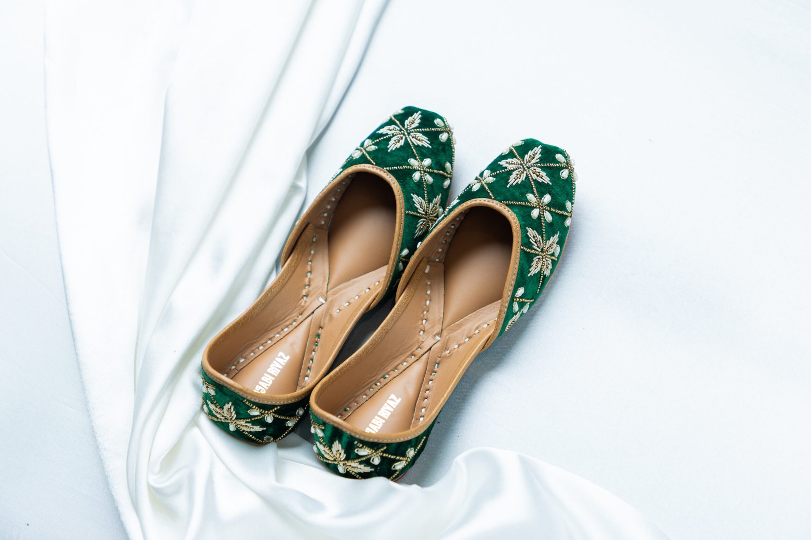Armaan captures a bold festive spirit wrapped in timeless elegance. Set on a deep emerald green base, this pair is adorned with finely hand-embroidered geometric florals, highlighted with soft ivory details and warm golden threadwork. Rich in depth yet graceful in feel, Armaan is crafted for women who love expressive ethnic style with a refined finish — ideal for mehndi nights, festive evenings, and intimate wedding celebrations.