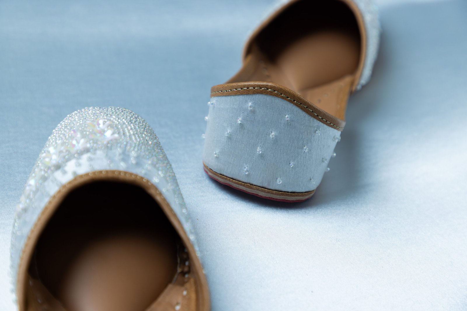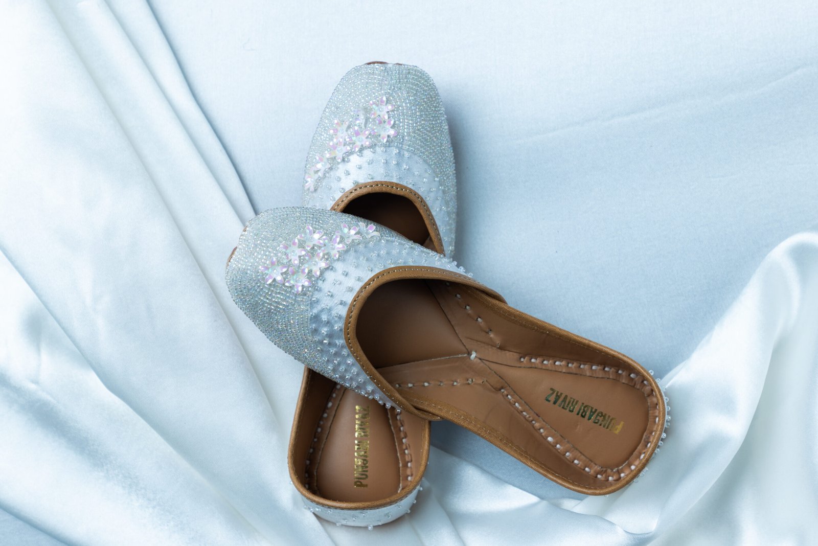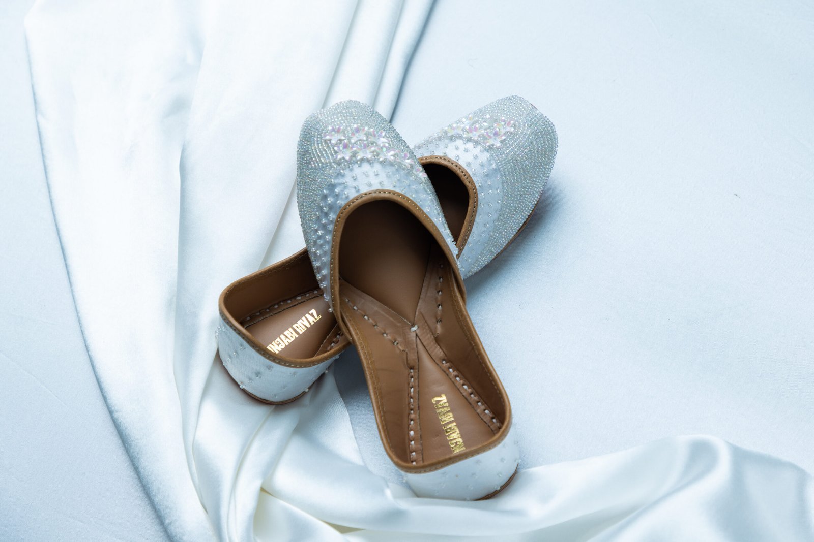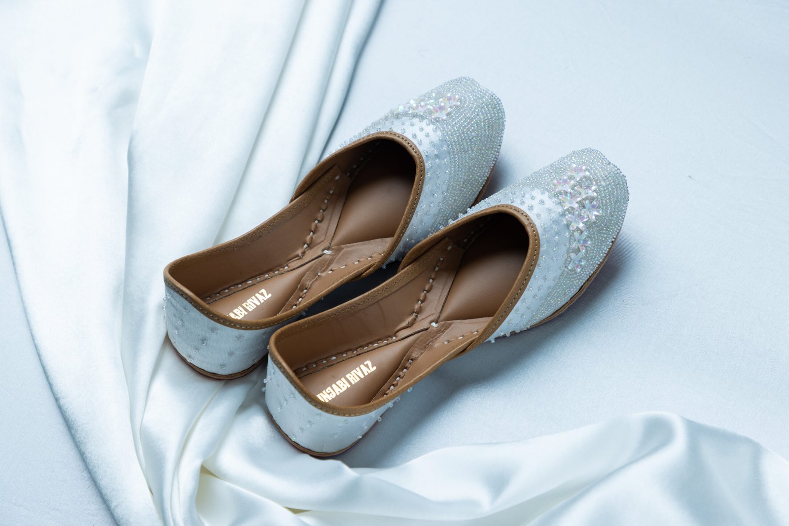 Chhaan captures the soft glow of moonlight in every step. Designed on a serene silver-white base, this pair features delicate beadwork and subtle floral accents that shimmer gracefully without overpowering the look. Elegant, refined, and timeless, it’s the perfect choice for brides and special occasions where understated luxury speaks the loudest.