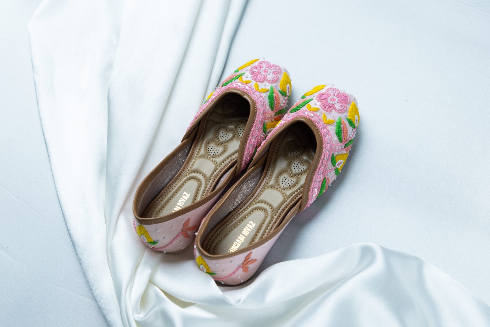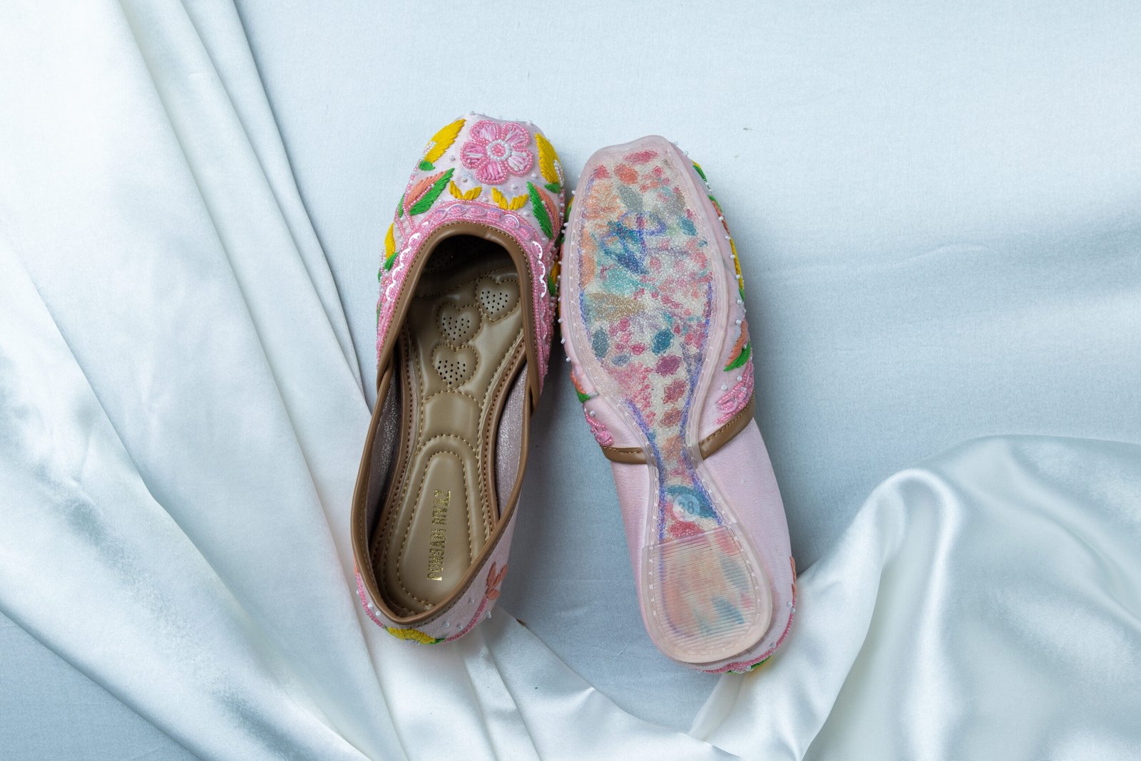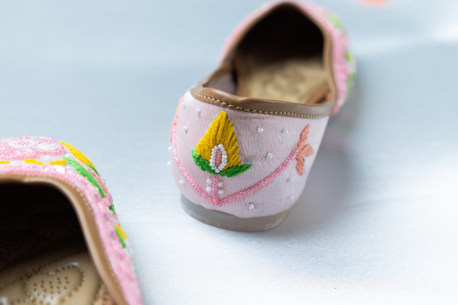Gulabi captures soft femininity and joyful elegance. Crafted on a gentle pastel pink base, this pair features delicate hand embroidery inspired by blooming florals, highlighted with cheerful accents of yellow and green. Graceful yet playful, Gulabi brings a fresh, youthful charm to traditional footwear. Lightweight and comfortable, it is designed for women who love subtle colour, floral beauty, and effortless festive style — ideal for daytime celebrations, festive gatherings, and intimate occasions.