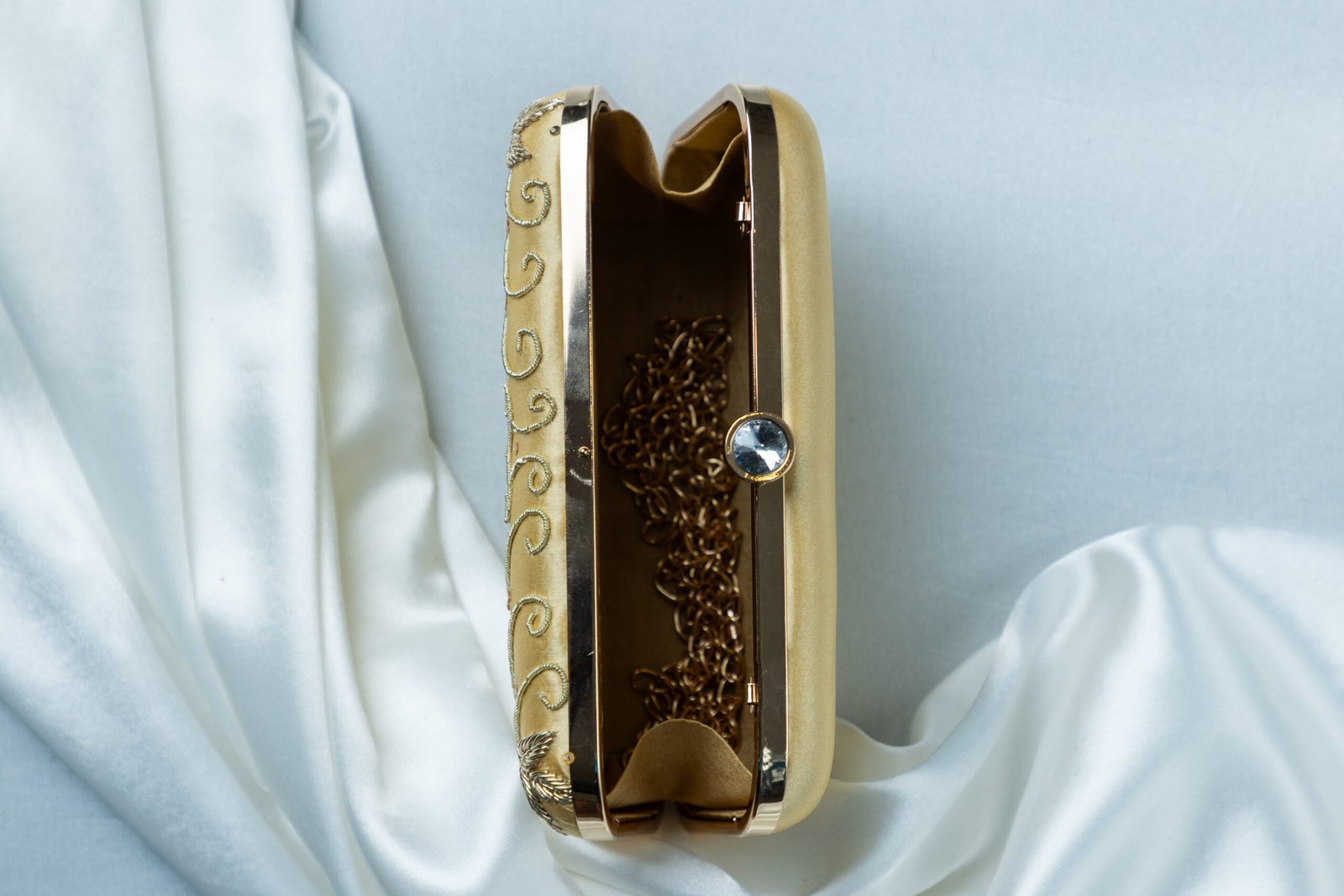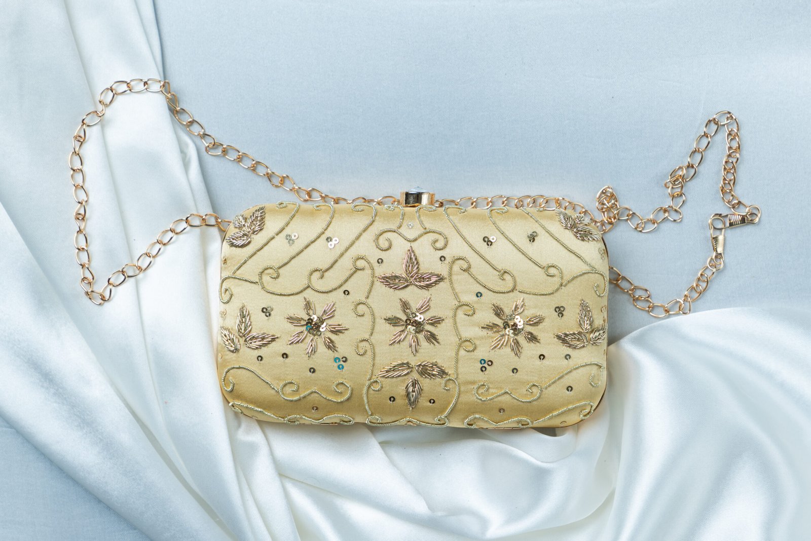 A graceful handcrafted clutch in soft ivory tones, beautifully detailed with delicate metallic embroidery and subtle sequin accents. Designed with a structured silhouette, a sleek metallic frame, and a detachable gold chain, this clutch pairs effortlessly with bridal, festive, and evening ensembles.