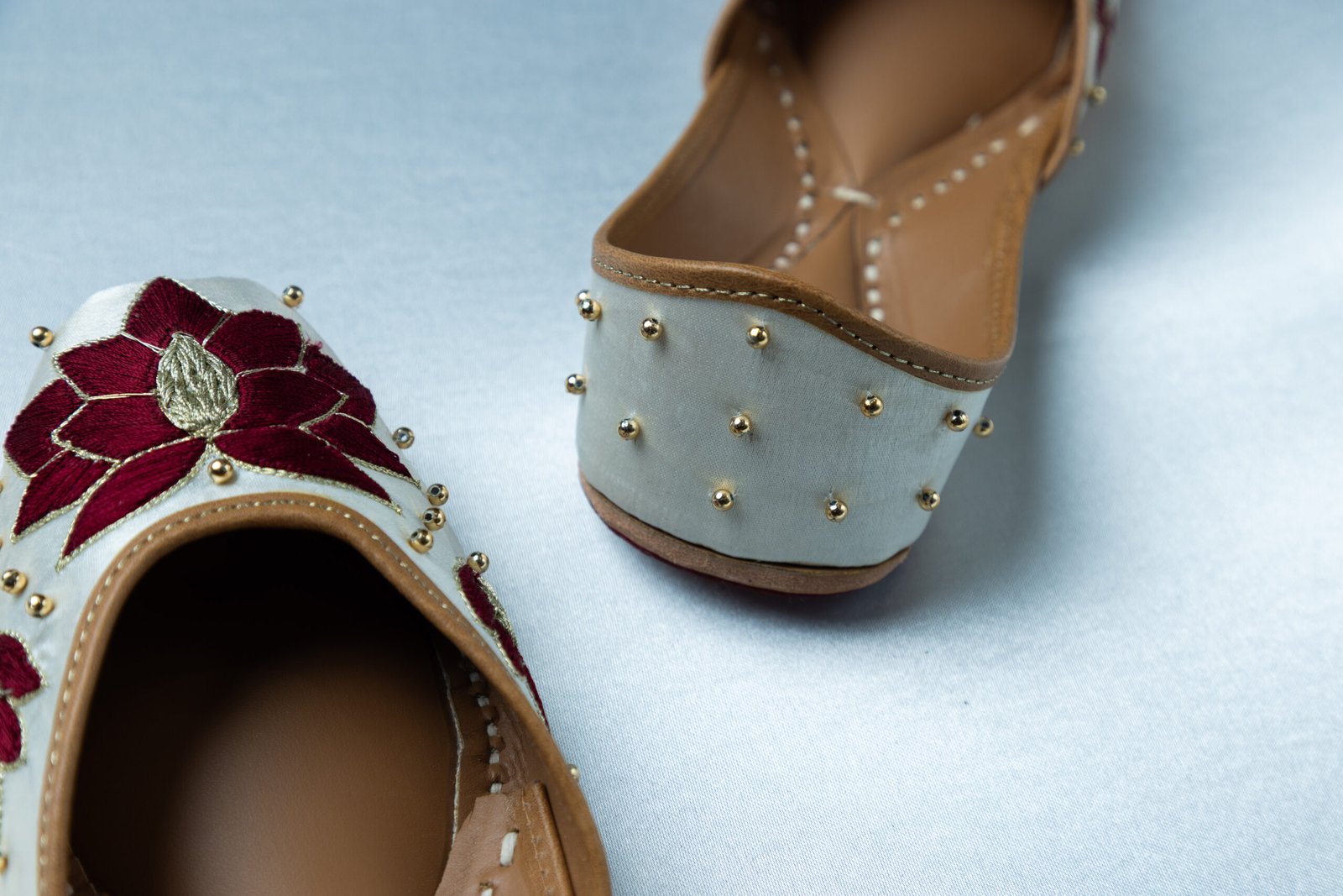 Crafted on a pristine ivory base with rich maroon floral embroidery and delicate gold bead accents, Kaleeraj juttis are designed for brides who love timeless elegance with a touch of regal charm. The intricate handcrafted detailing makes this pair perfect for wedding ceremonies, pheras, and special bridal moments, while ensuring comfort throughout the day.
