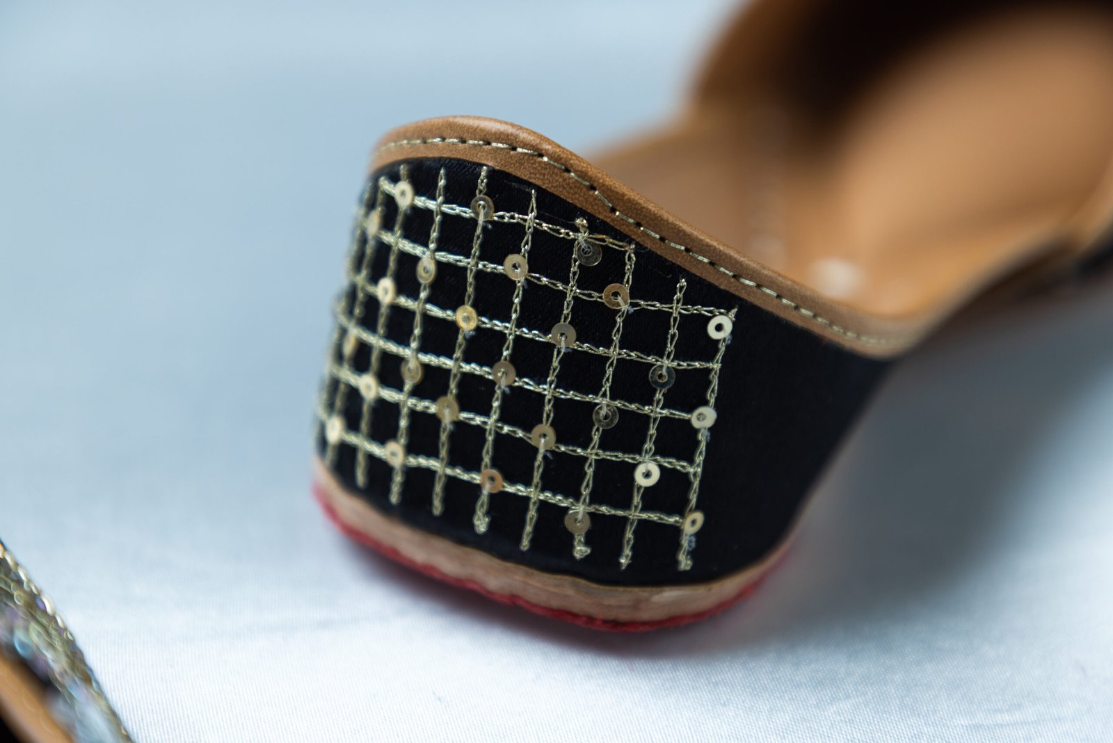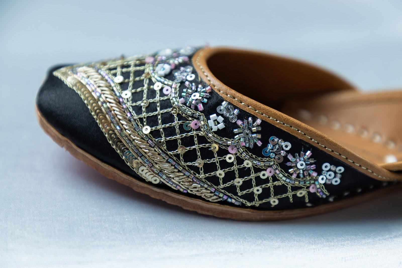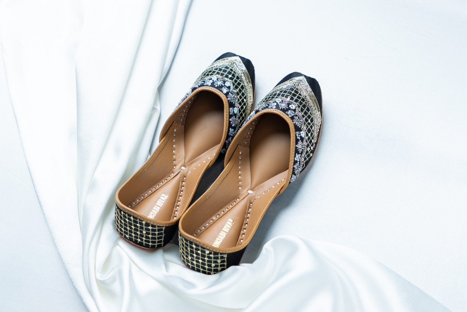 Nazakat juttis are a true expression of subtle luxury and refined craftsmanship. Designed in a classic black base with intricate silver and pastel-toned handcrafted embroidery, this pair brings together elegance and tradition effortlessly. Ideal for evening celebrations, festive gatherings, and elegant occasions, these juttis add a graceful charm while keeping comfort at the forefront.