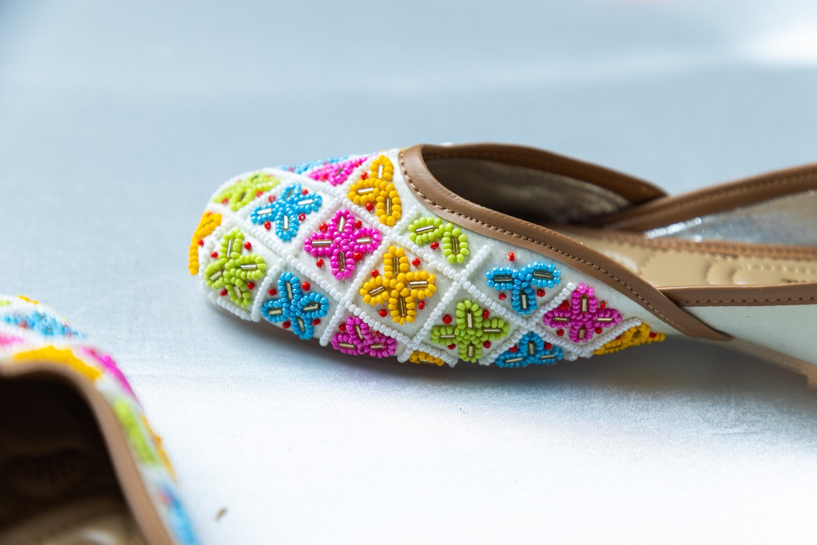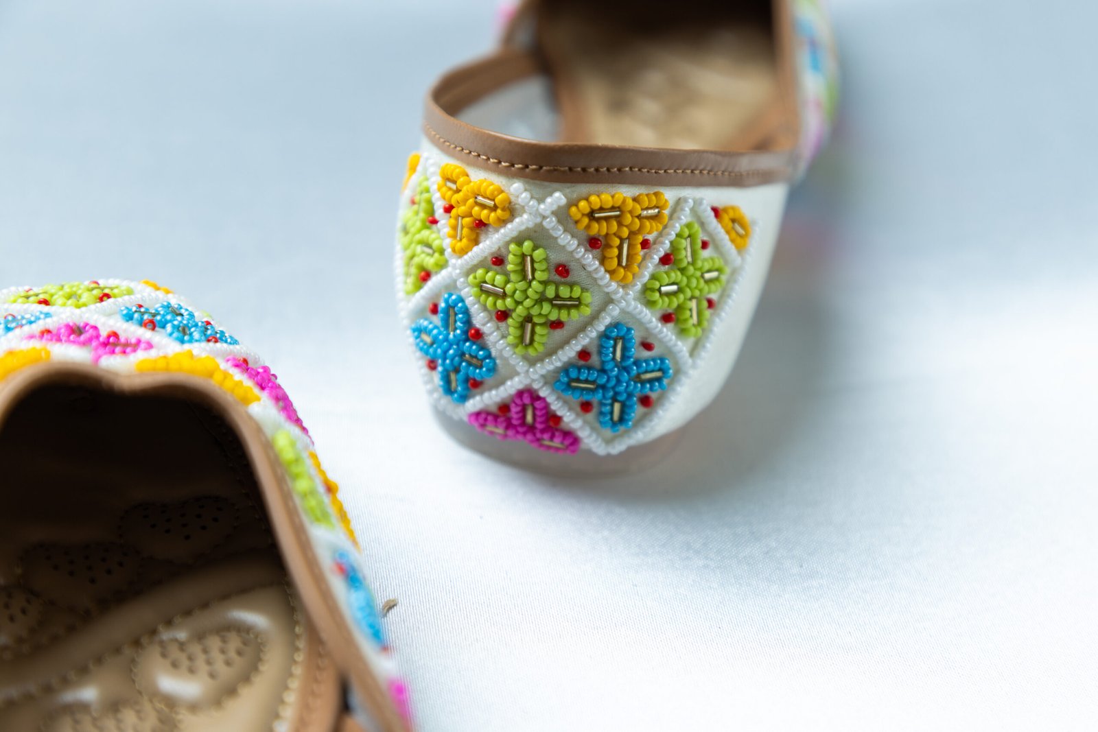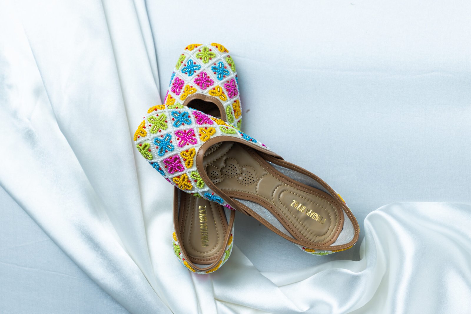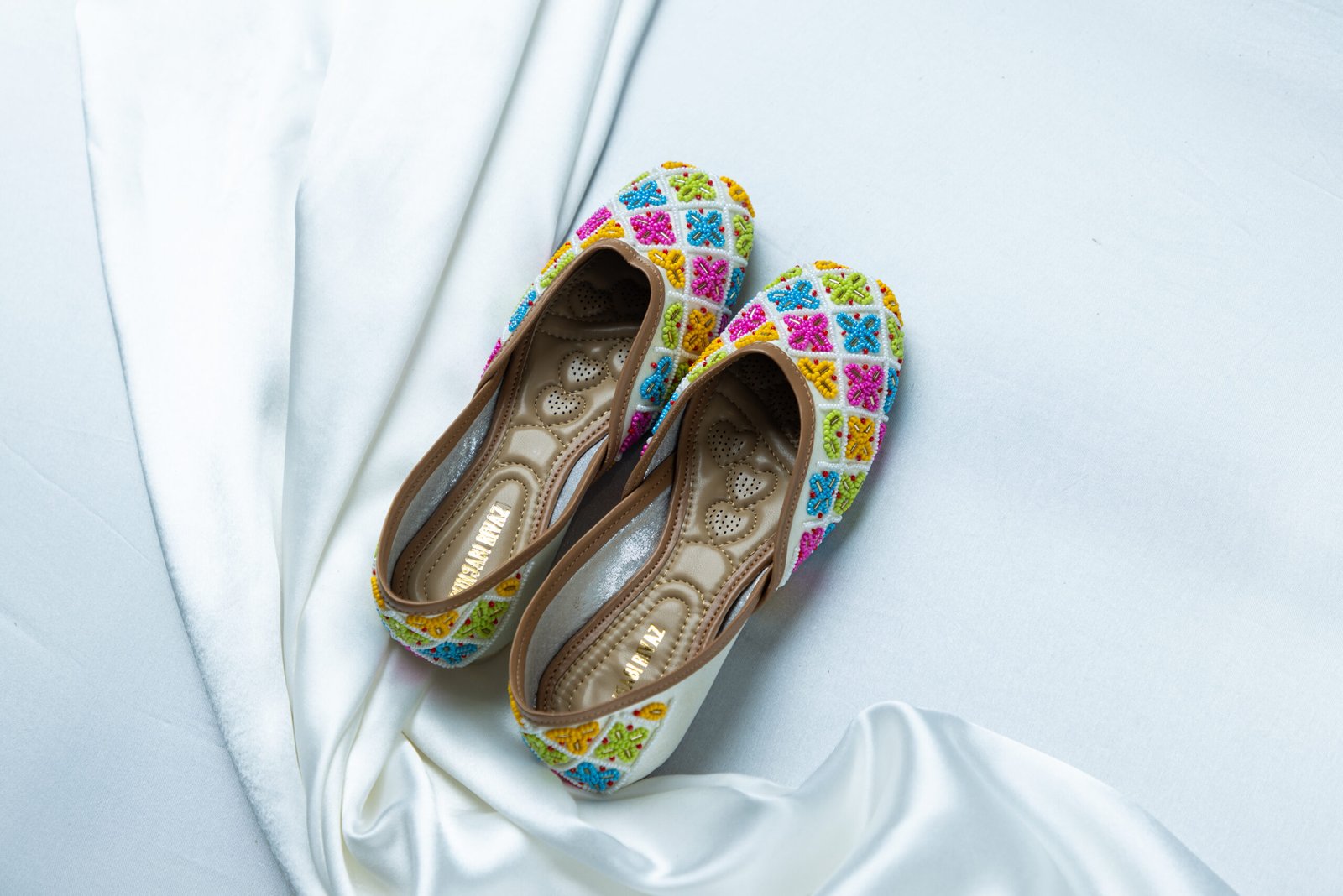 Rangila celebrates colour, joy, and vibrant craftsmanship. Designed on a soft ivory base, this pair is beautifully hand-embroidered with lively geometric floral motifs in cheerful hues of pink, blue, green, and yellow. Playful yet elegant, Rangila brings a fresh festive spirit to traditional footwear. Light in feel and rich in detail, it is perfect for women who love expressive colours without compromising on comfort — ideal for festive gatherings, daytime celebrations, and joyful occasions.