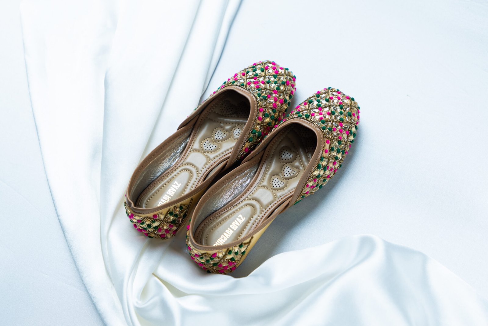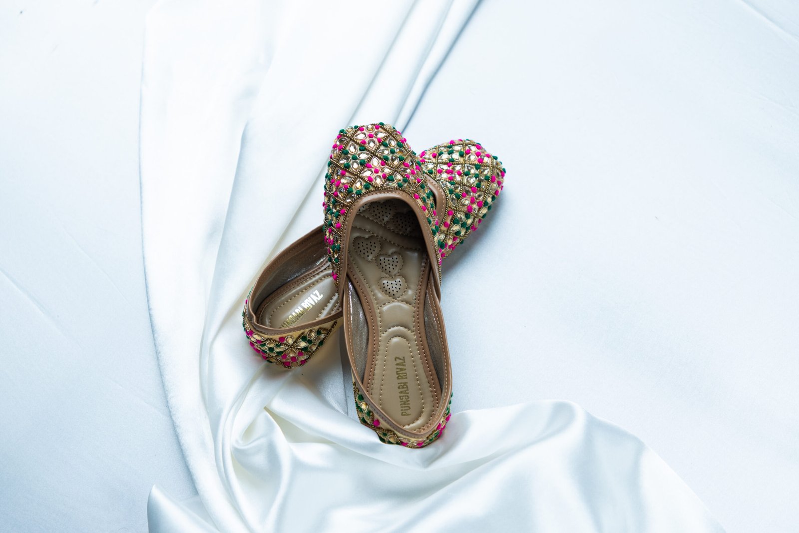 Rangili is a celebration of colour, joy, and Punjabi festivity. Designed on a warm neutral base, this pair comes alive with intricate hand embellishments in lively pink and green tones, arranged in a rich lattice pattern with delicate gold detailing. Bold yet balanced, Rangili is crafted for women who love expressive style without compromising on elegance — perfect for wedding functions, festive nights, and joyful celebrations.