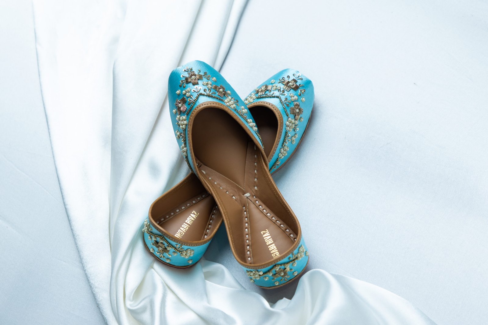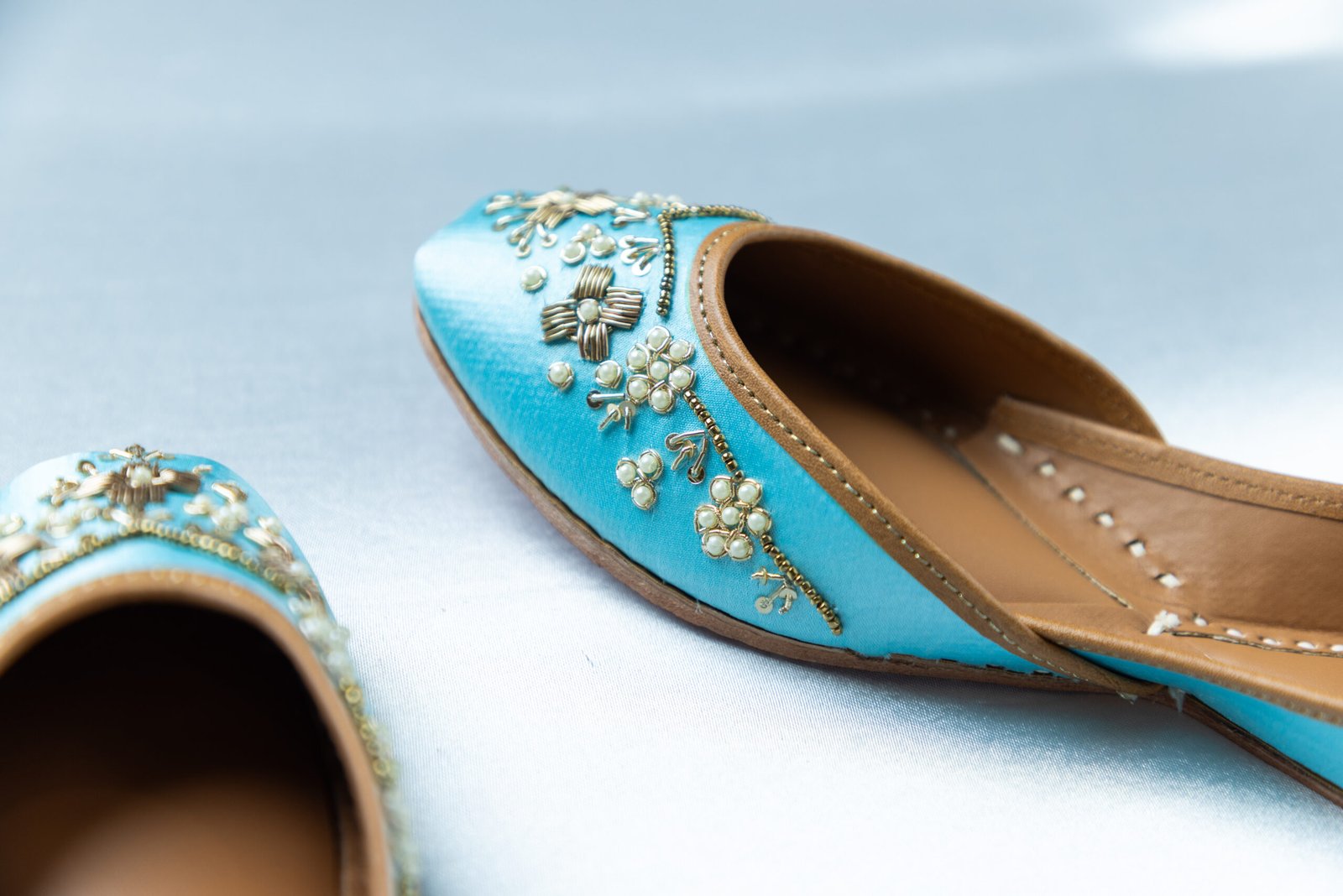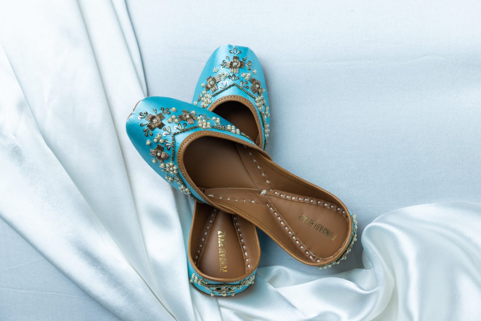 Crafted in soothing sky-blue fabric and adorned with intricate gold and pearl handcrafted embroidery, Roohani Neel juttis reflect serene elegance with a bridal charm. Ideal for weddings, pre-wedding rituals, and graceful celebrations, this pair blends delicate beauty with luxurious comfort.