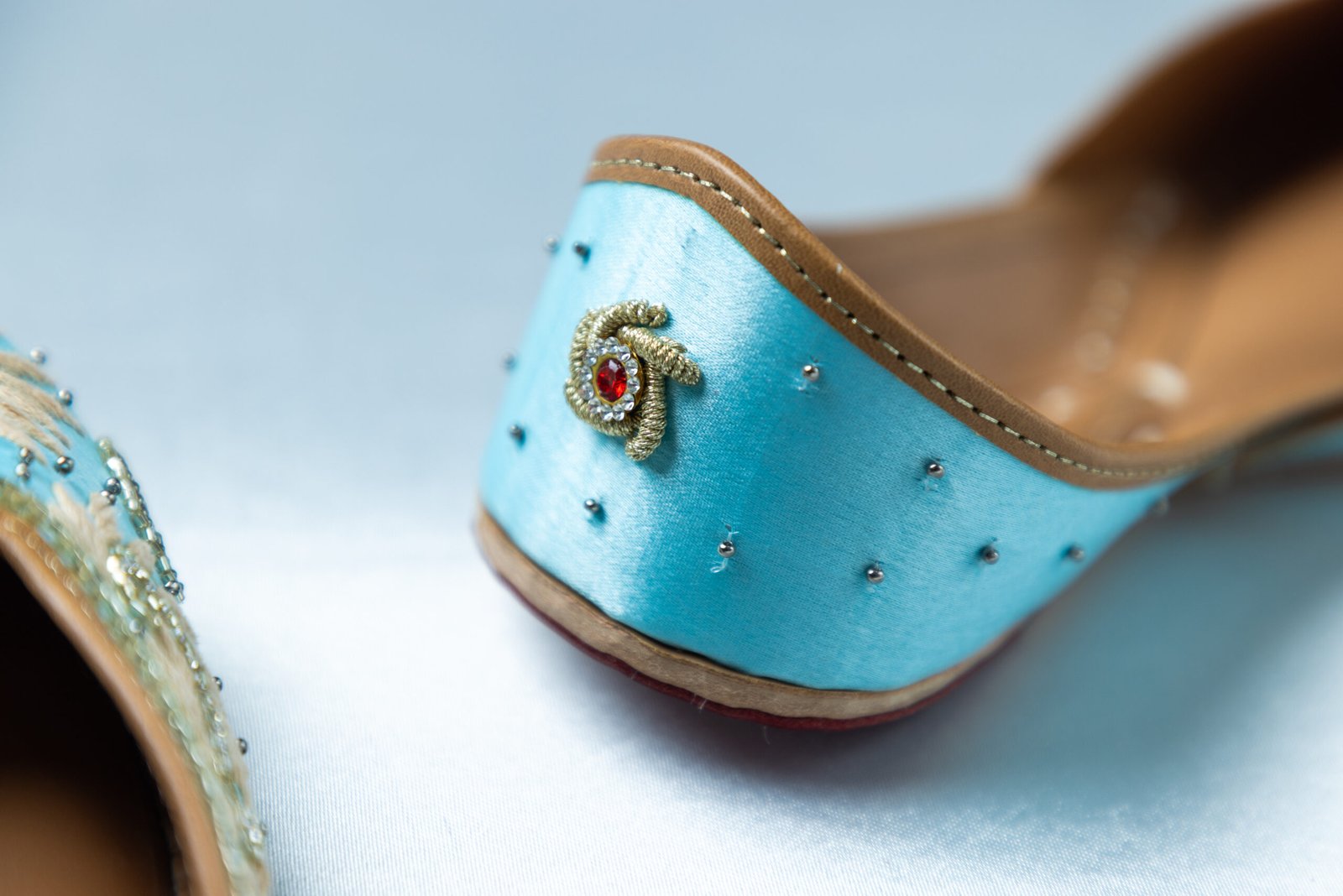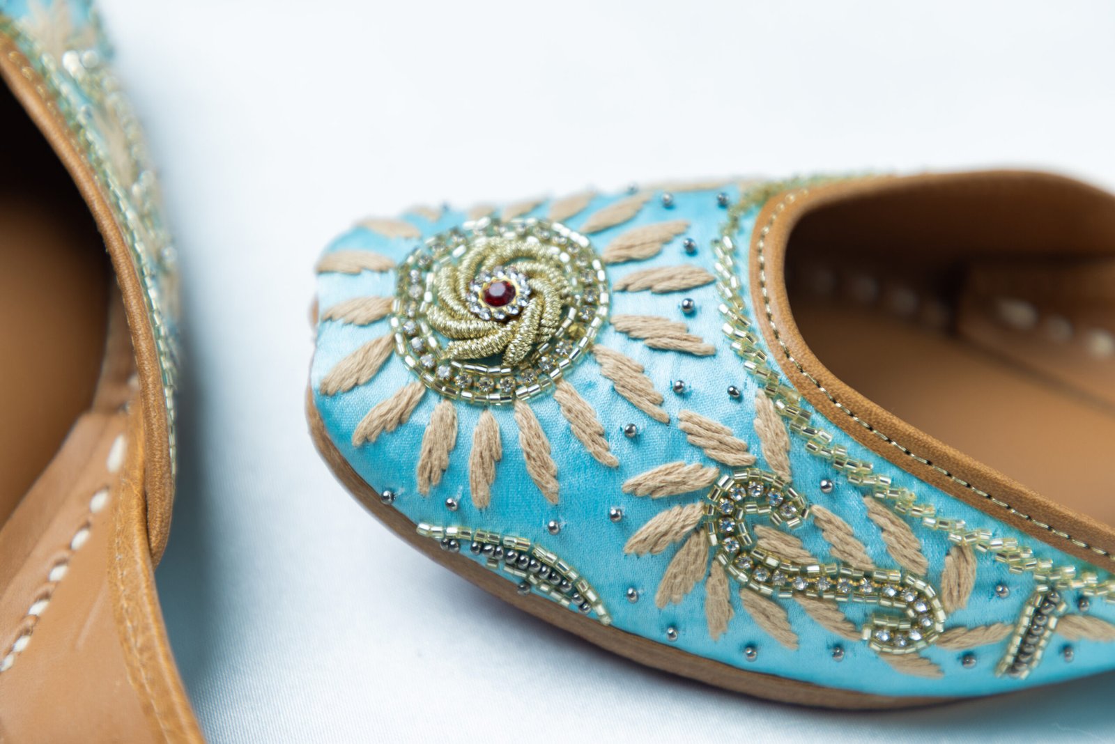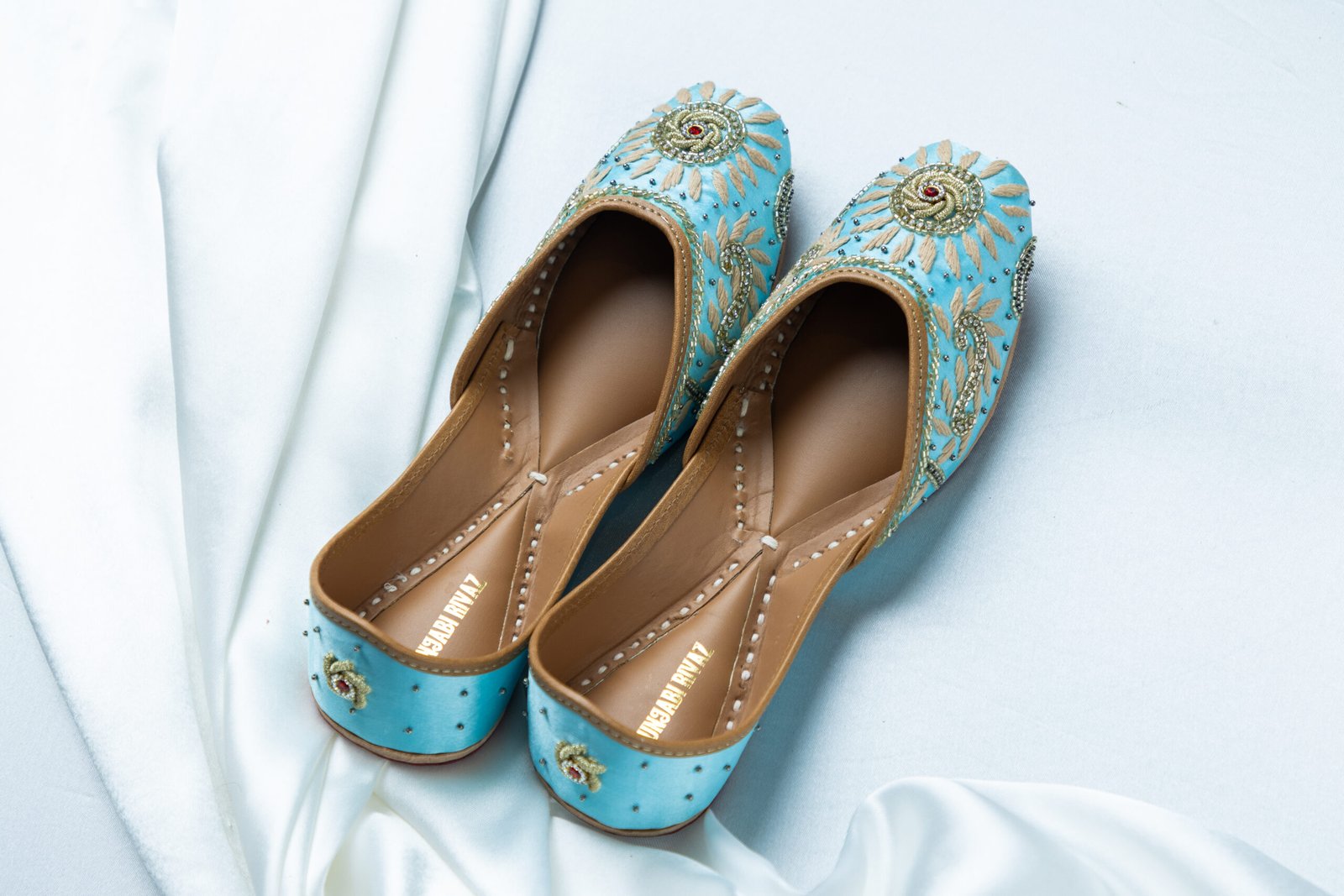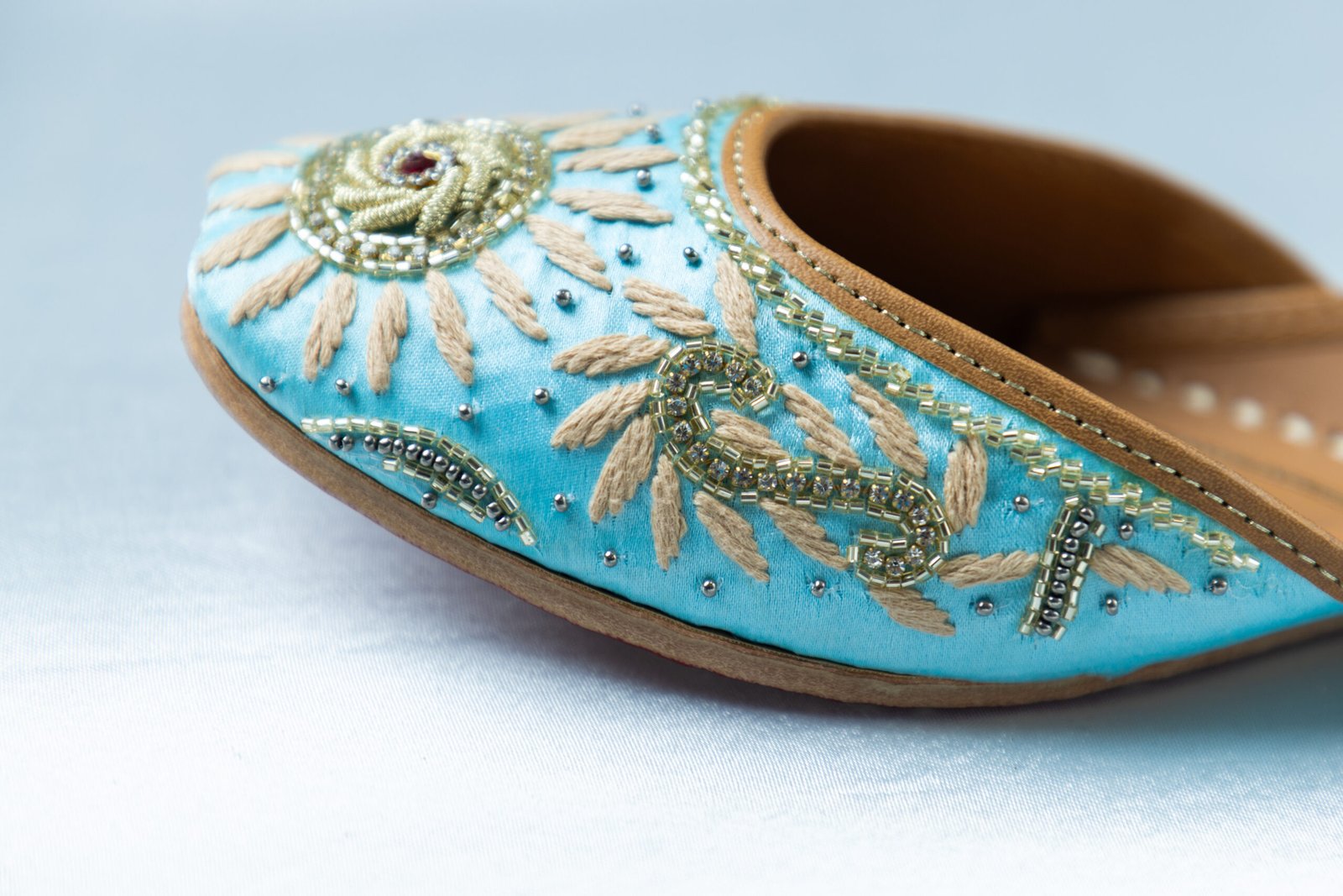 Sahaj reflects calm elegance and effortless charm. Crafted on a soothing sky-blue base, this pair features delicate hand embroidery inspired by sunburst motifs, finished with subtle gold detailing and fine bead accents. Light on the feet yet rich in character, Sahaj is designed for women who love refined festive style without heaviness — perfect for daytime celebrations, mehndi functions, and elegant gatherings.